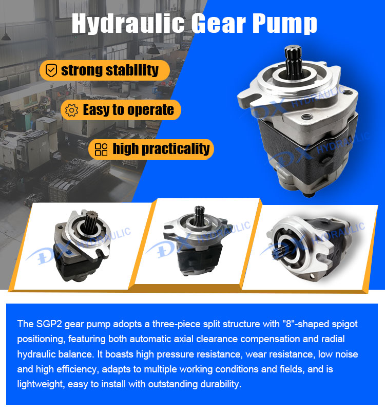 The SGP2 gear pump adopts a three-piece split structure with "8"-shaped spigot positioning, featuring both automatic axial clearance compensation and radial hydraulic balance. It boasts high pressure resistance, wear resistance, low noise and high efficiency, adapts to multiple working conditions and fields, and is lightweight, easy to install with outstanding durability.