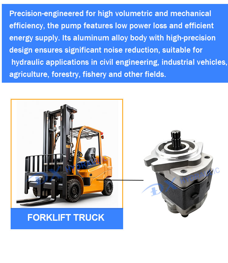Precision-engineered for high volumetric and mechanical efficiency, the pump features low power loss and efficient energy supply. Its aluminum alloy body with high-precision design ensures significant noise reduction, suitable for hydraulic applications in civil engineering, industrial vehicles, agriculture, forestry, fishery and other fields.