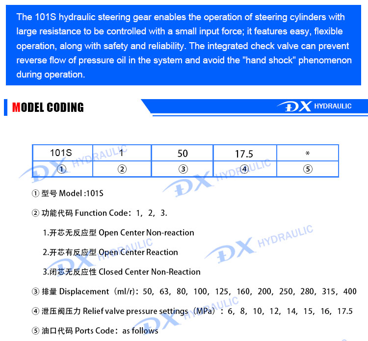 The 101S hydraulic steering gear enables the operation of steering cylinders with large resistance to be controlled with a small input force; it features easy, flexible operation, along with safety and reliability. The integrated check valve can prevent reverse flow of pressure oil in the system and avoid the "hand shock" phenomenon during operation.