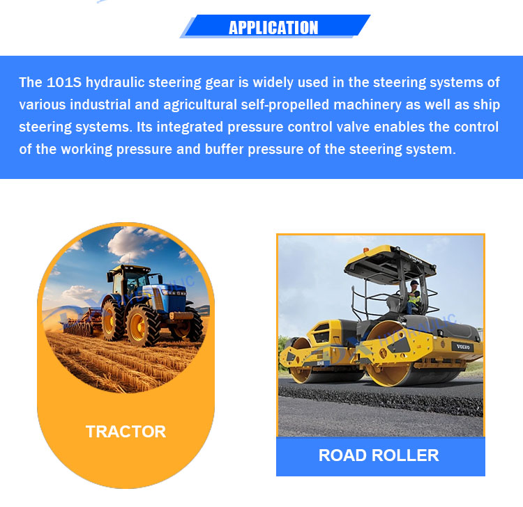 The 101S hydraulic steering gear is widely used in the steering systems of various industrial and agricultural self-propelled machinery as well as ship steering systems. Its integrated pressure control valve enables the control of the working pressure and buffer pressure of the steering system.