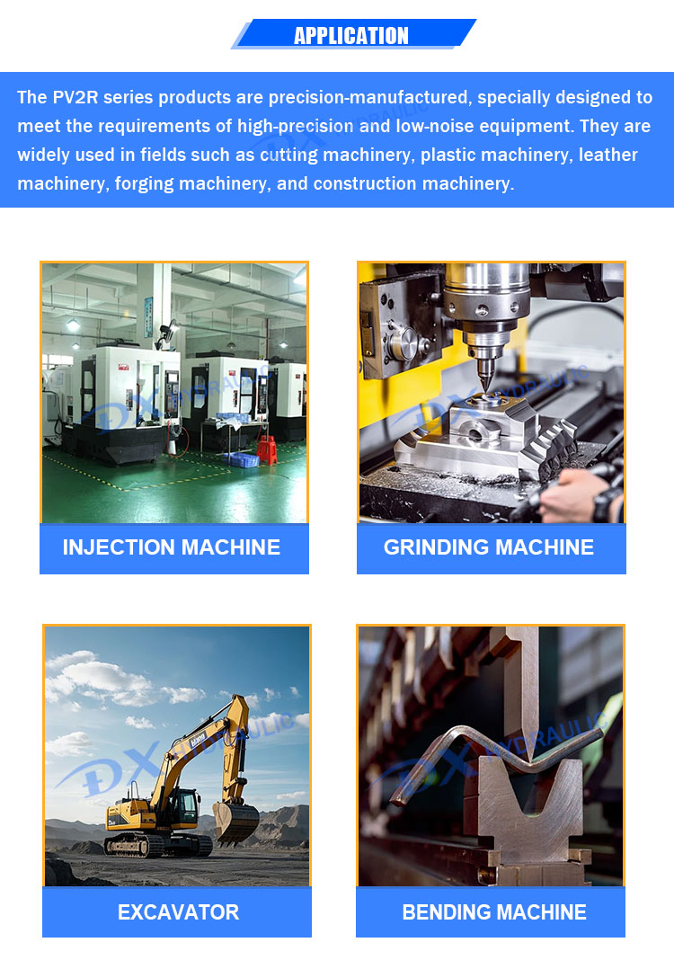 The PV2R series products are precision-manufactured, specially designed to meet the requirements of high-precision and low-noise equipment. They are widely used in fields such as cutting machinery, plastic machinery, leather machinery, forging machinery, and construction machinery.