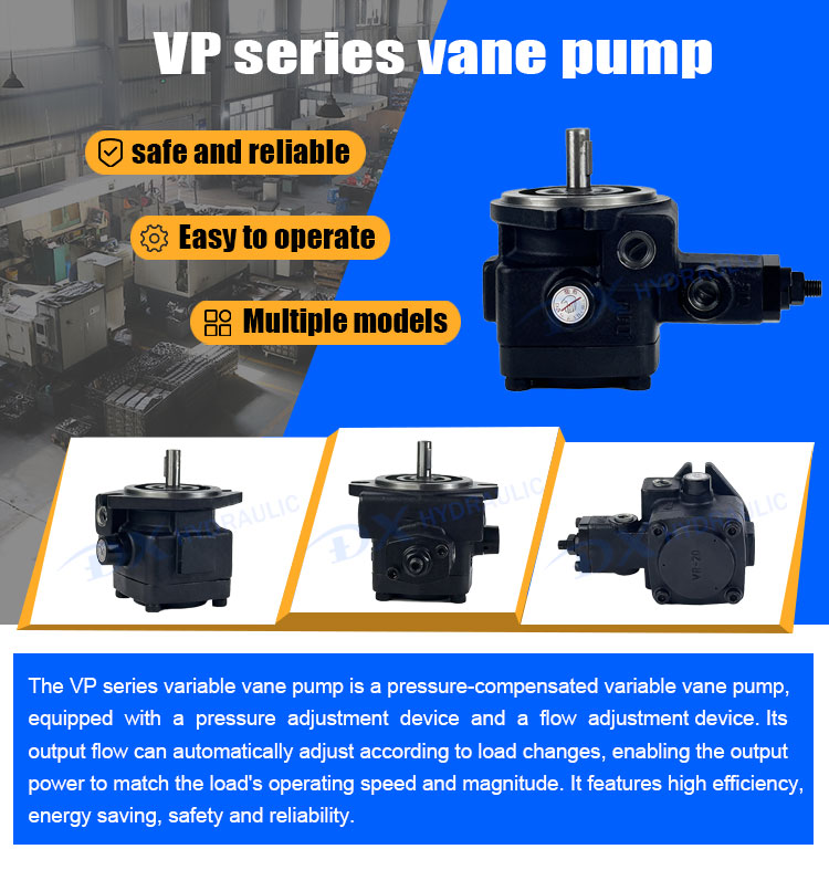 The VP series variable vane pump is a pressure-compensated variable vane pump, equipped with a pressure adjustment device and a flow adjustment device. Its output flow can automatically adjust according to load changes, enabling the output power to match the load's operating speed and magnitude. It features high efficiency, energy saving, safety and reliability.