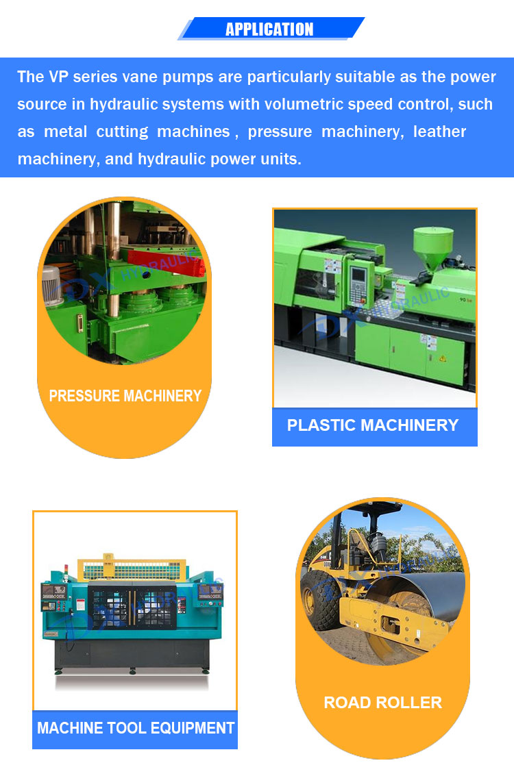 The VP series vane pumps are particularly suitable as the power source in hydraulic systems with volumetric speed control, such as metal cutting machines, pressure machinery, leather machinery, and hydraulic power units.